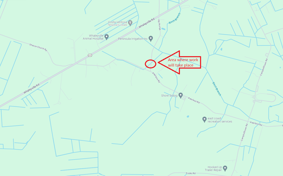 On July 9 a portion of Murray Road will be closed while crews work to replace a failed crossroad pipe. Repairs should be completed the same day. DETOUR: motorists can take Peerless Road to Whaleyville Road to Murray Road. For further assistance, please contact the Roads Division at 410-632-2244.
