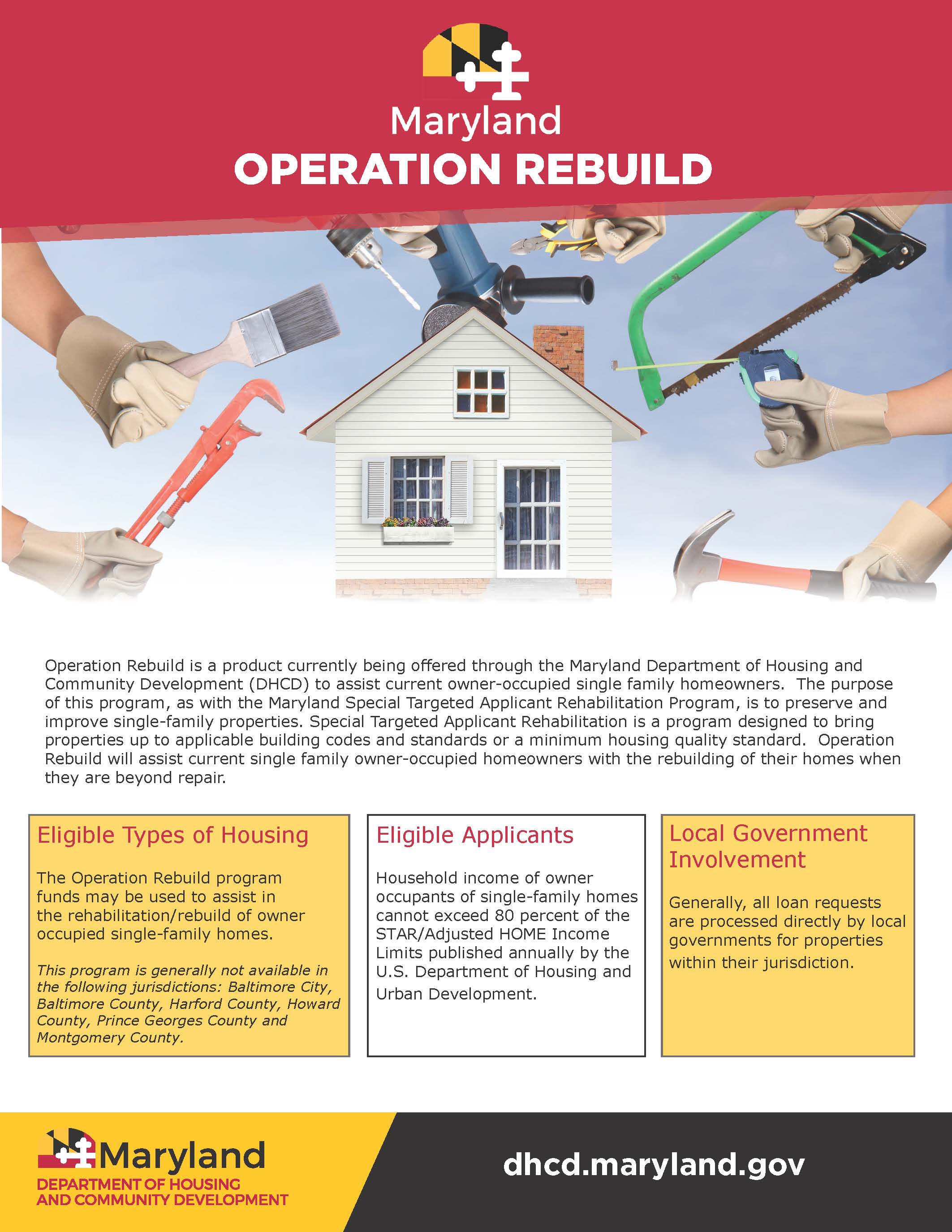 If you own and reside in a single-family home in Worcester County and need assistance to improve your property, stop by the Operation Rebuild info session on June 1 at the Pocomoke Branch Library or June 5 at the Berlin Branch Library. Meet Housing Rehabilitation Program Coordinator Davida Washington, and learn how Operation Rebuild may be able to assist property owners obtain grants and/or low interest loans-rates based on income to rebuild homes beyond repair.