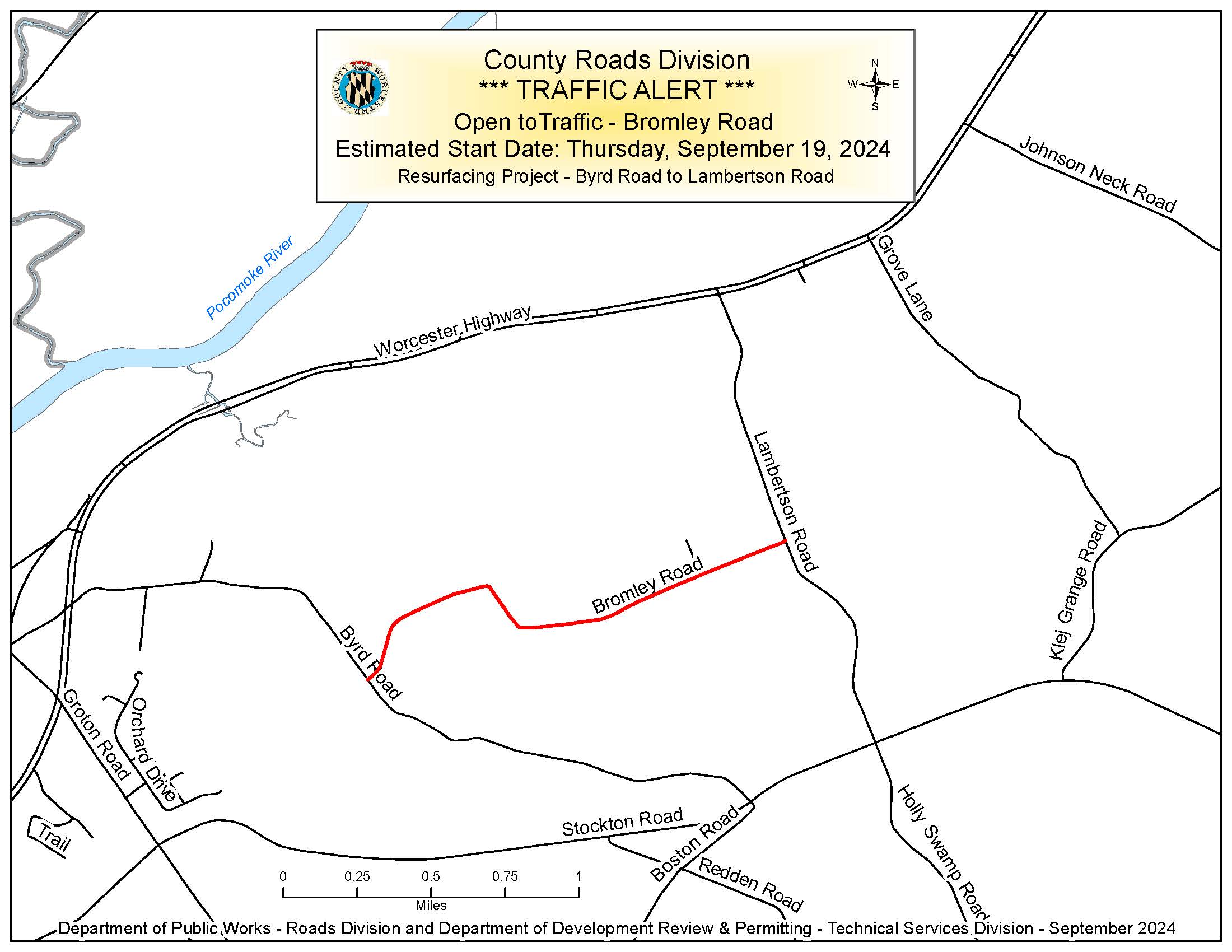 Alan Myers, the county’s paving contractor, will be paving Bromley Road on Friday, September 20. The project should take two days to complete. The road will remain open; however, motorists can expect traffic delays while work is being performed. Flaggers will be in place to guide people through the work zone safely. For more information, please call the Worcester County Roads Division at 410-632-2244.