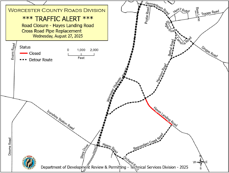 Tues., Aug. 19, from 8 a.m. to 4 p.m., the intersection of Harrison Road and Hayes Landing Road will be closed while crews replace a failed crossroad pipe and remove a storm drain that is no longer needed. The work will take place weather permitting. Detour signs will be in place to help guide motorists around the closure. For more information, contact the Roads Division at 410-632-2244.