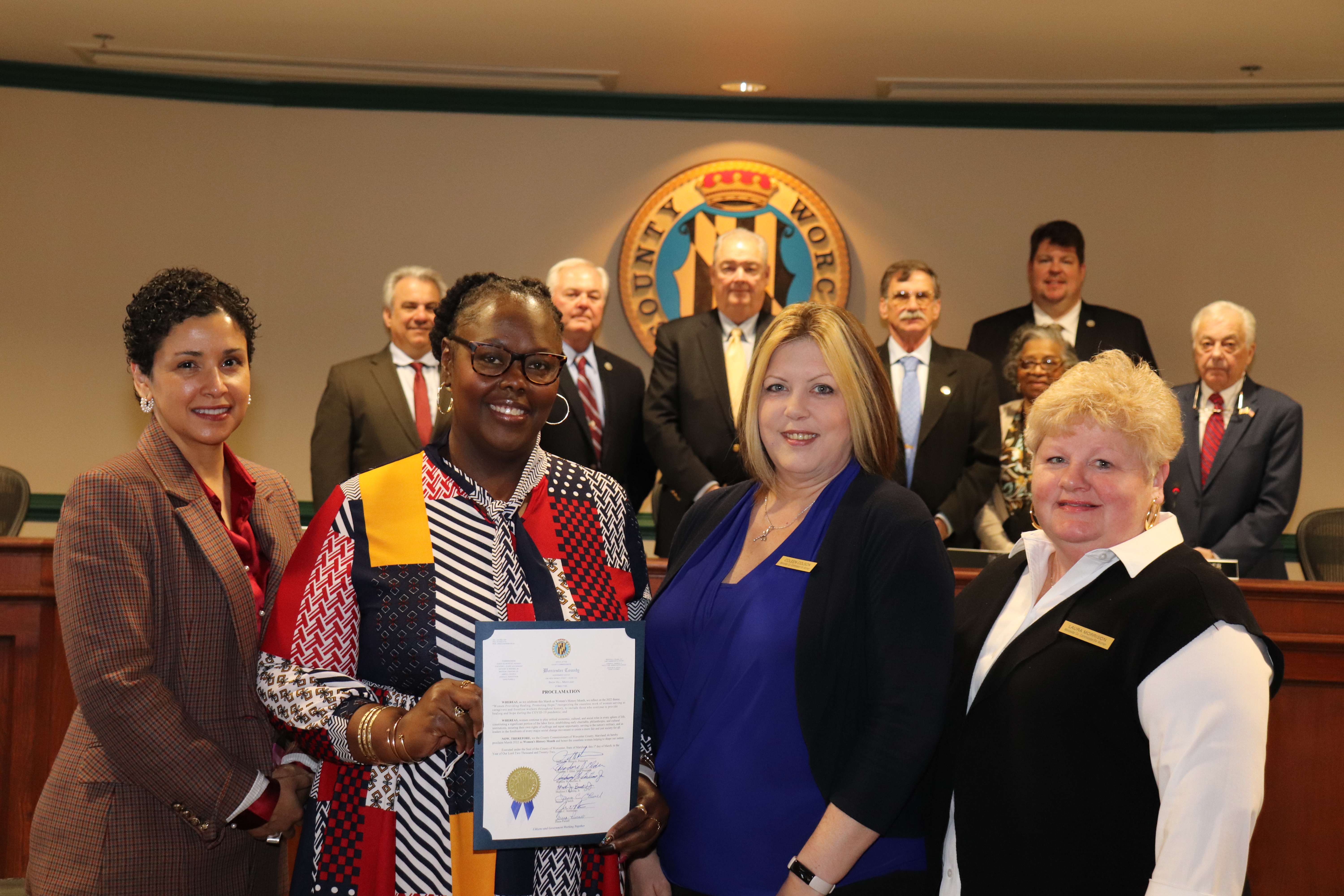March 1, 2022, Worcester County Commissioners present a proclamation recognizing March as Women’s History Month to Commission for Women (CFW) members, honoring the contributions of these and other exemplary women to the economic, cultural, and social well-being of Worcester County. Those pictured include CFW members Terri Shockley (front row, from left), Chair Tamara White, Laura Morrison, and Co-Chair Coleen Colson; and Commissioners Chip Bertino (second row, from left), Jim Bunting, Joe Mitrecic, Ted Elder, Diana Purnell, Josh Nordstrom, and Bud Church.