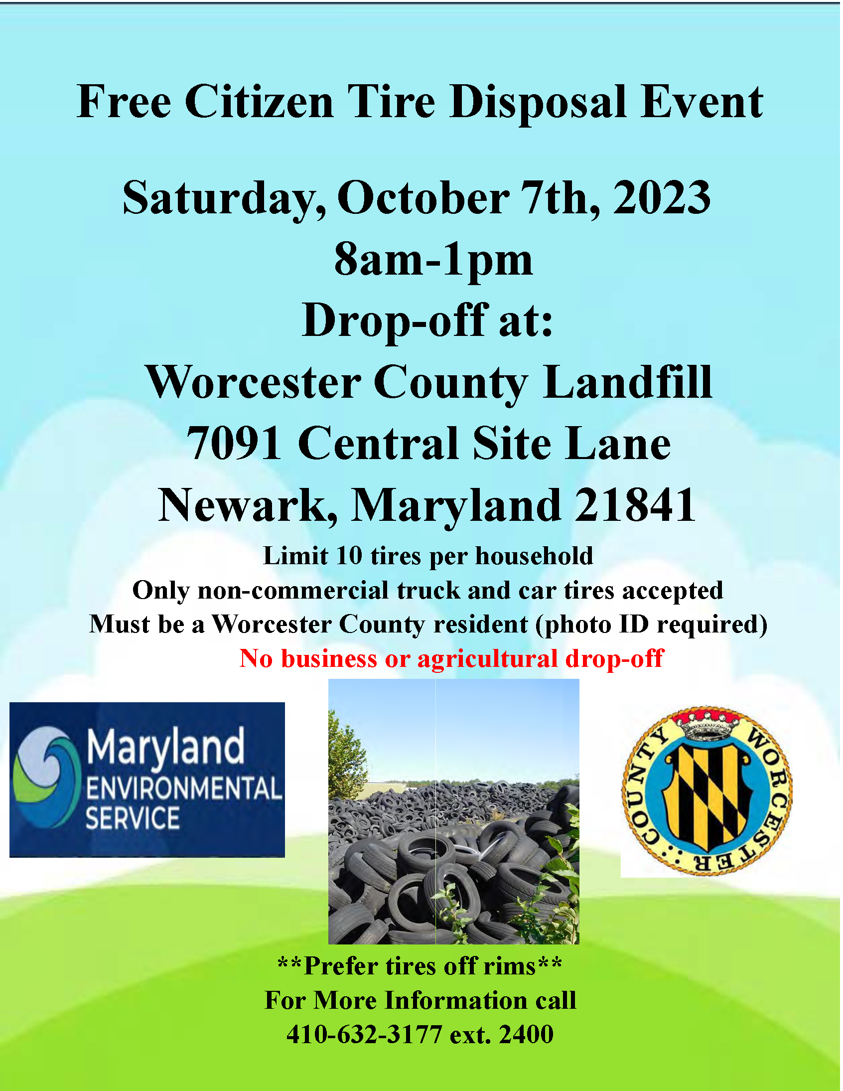The Worcester County Commissioners and the Public Works Recycling Division, in conjunction with the Maryland Department of the Environment and Maryland Environmental Services, will host Citizens Scrap Tire Drop-Off Day on Saturday, October 7, 2023, from 8 a.m. until 1 p.m. This event will take place at the Central Landfill in Newark.